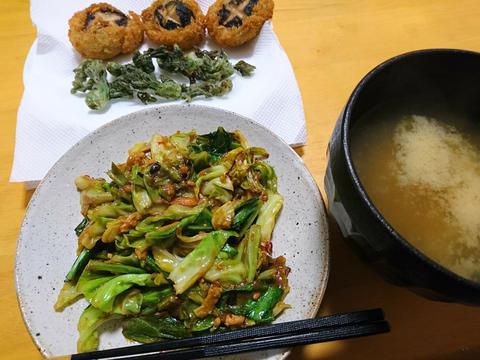キャベツ炒めと、買ってきた椎茸フライ&タラの芽の天ぷら。