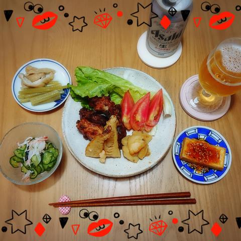 タケノコの唐揚げは、大変美味しかったね。厚揚げには、食べるラー油が掛かってます。