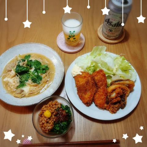 先生は今日も遅いので1人ご飯。昨日のオムライスの余った材料で親子煮。鳥肉が少なかったのでえのき足しました。あと、昨日、県民ショーで紹介されてて食べたくなった「モロヘイヤ」。納豆と混ぜたら最高に美味しい‼️