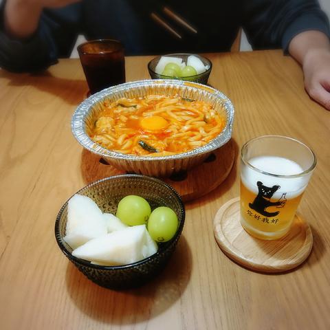果物と冷凍のキムチうどんで遅い夕飯
