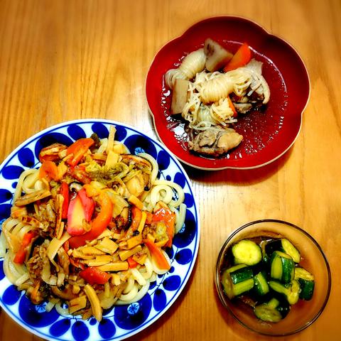 八宝菜の残りを醤油で炒めたうどんにかけました。