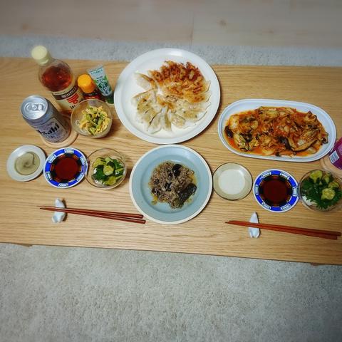 餃子も、カキと椎茸のキムチ炒めも、キュウリも全部美味しかった。💯💮。