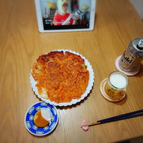 帰ってきて冷凍庫の残り物で先生の夕飯を作り。キムチが余ってたからキムチチヂミ‼️適当に作ったら、めっっちゃ美味しい‼️先生の分なくなりそう(笑)