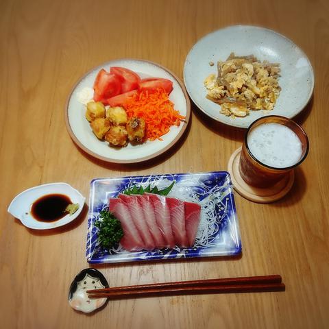 冷蔵庫のものを食べなきゃ。でも金曜日だから刺し身も買った❗