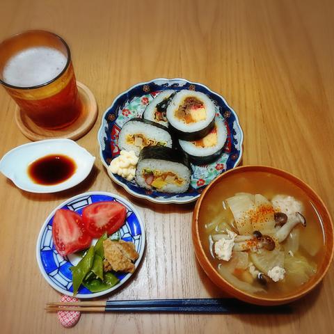 引き続き恵方巻きです。かたくなったのでチンしました。汁物は鶏団子入り。
