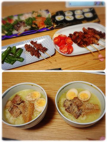 近所のやきとりやさんでテイクアウトしてきたやきとり❗やっぱり美味しい‼️あと、貝づくし刺盛。