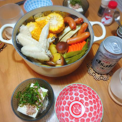 料理というか蒸しただけです。土曜日にマルコで蒸し器を買ったので早速ル・クルーゼにセットして作ってみました‼️