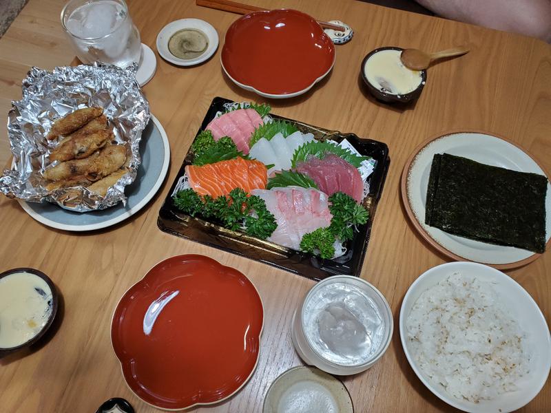 スーパーに半額のお刺身があったので買ってきて、手巻き寿司にしました。急に思いついたので刺身以外の具はなしですが、松茸入りの茶碗蒸し付き。なかなか豪華な夕飯になりました。