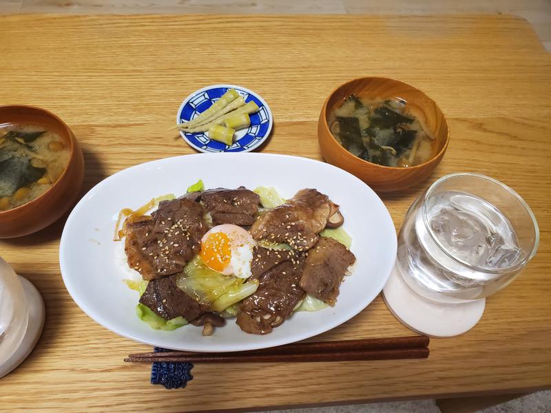 夕飯は先週刃物まつりで買った土佐あかうしで焼肉丼。