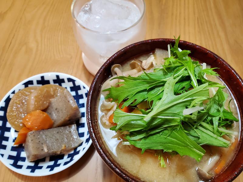 今日は大事なプデュの日なので簡単にうどん😏昨日仕込んであった豚汁さんが大活躍です。