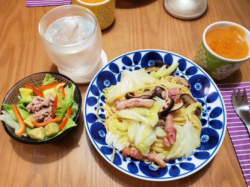 夕飯は久しぶりのパスタ🍝先週石鎚山SAで買ったベーコンを使ったペペロンチーノ。