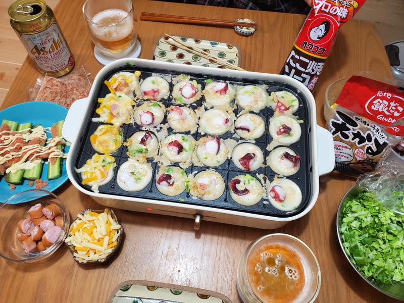 夜はたこ焼きです。料理したとは言わないが、休みじゃないとなかなか食べられなしね😆久しぶりのお家たこ焼きは最高でした🐙