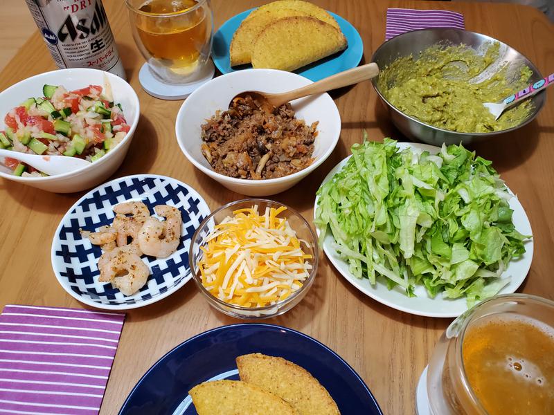 今夜は業務スーパーで売ってたタコシェルを使ってタコス☺️時間があったので、具も沢山用意しました~。ワカモレはシーズニングを使いましたが、あとはネットをみて適当に。なかなかおいしかったです。次はソフトな皮のほうで作ってみたいです‼️