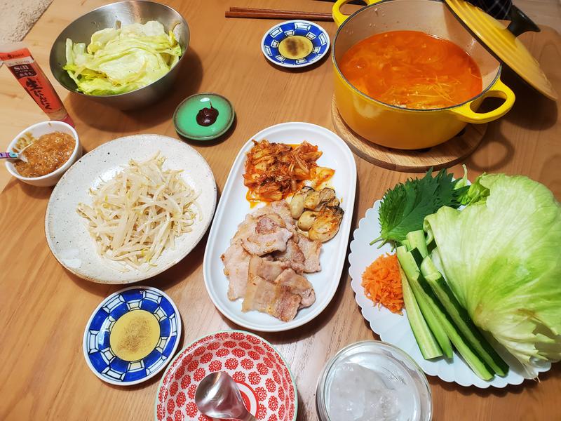 サムジャンも作ってサムギョプサル😆チョレギサラダ、もやしナムル、包む野菜もあるよ。