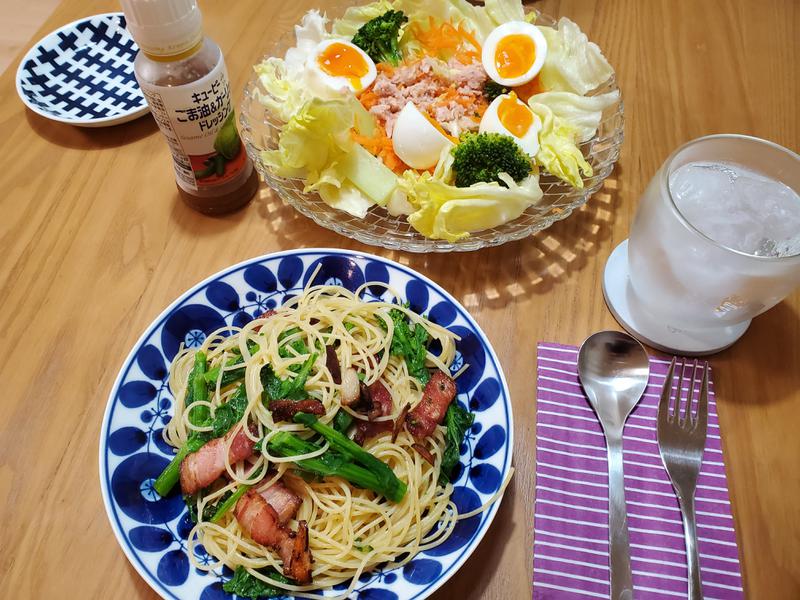 菜の花とベーコンのパスタです❗麺は糖質オフ😆