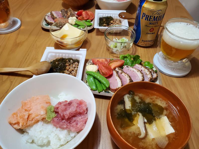 a priceで買ったネギトロとトロサーモンをのせました。あと、もずく納豆😆
