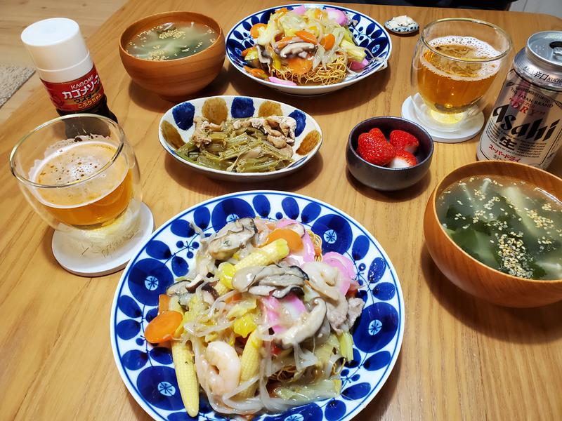 皿うどんは、とりあえず見栄をはって、1人2つずつのカキを上の方の方に持ってきてみました。笑