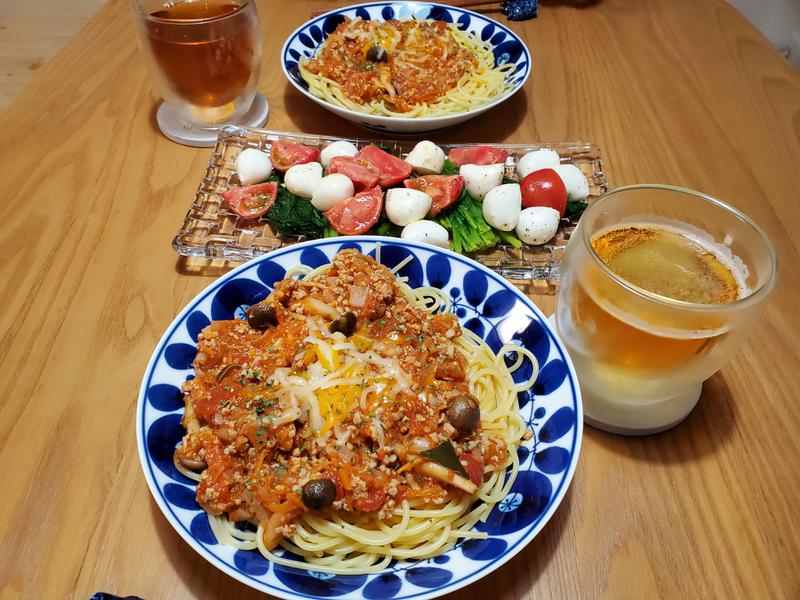 週はじめ、今日もバッタバタでした。帰ってきて、昨日作ってたミートソースを温めてパスタに🍝