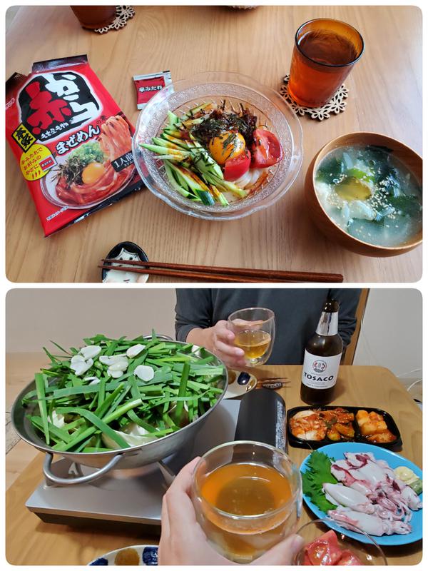 夜は前から気になっていたもつ鍋とみーをテイクアウトしてきましたー😆美味しい🍺〆は袋麺もご飯も食べたしね。。