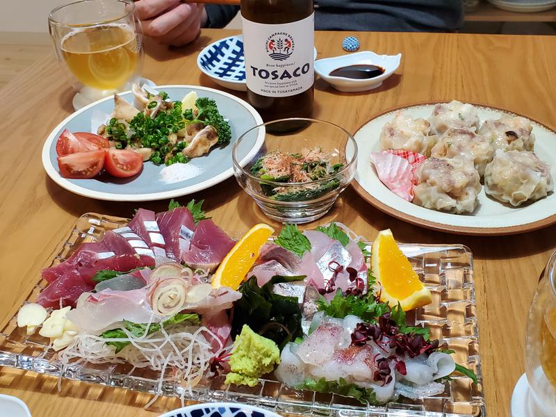 さて、夕飯は英屋でお刺身のテイクアウトしてきました。あと、焼売は凪でテイクアウト🥡