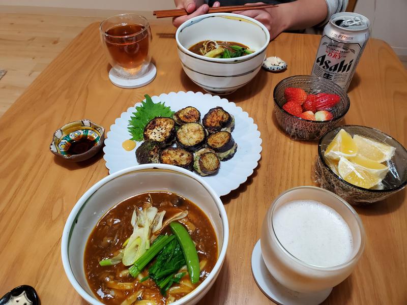 昨日の餃子で余った餡はナスに挟んで焼きました🥟