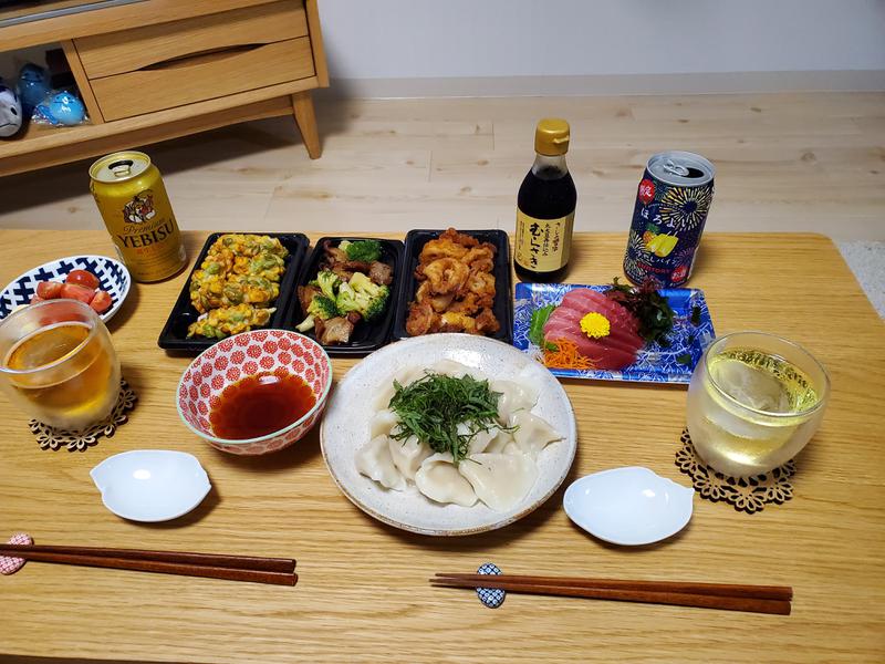 イオンで買ったお惣菜+大阪王将の水餃子🥟。
