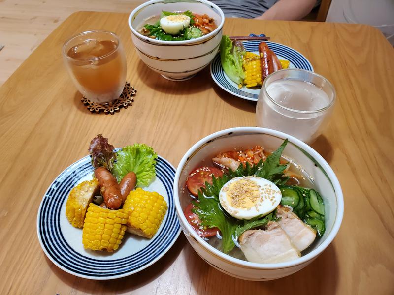 ポッサム作ったら冷麺もセットですよね。今日も韓国冷麺です。おいしいなー。とうもろこしも、おいしなー。
