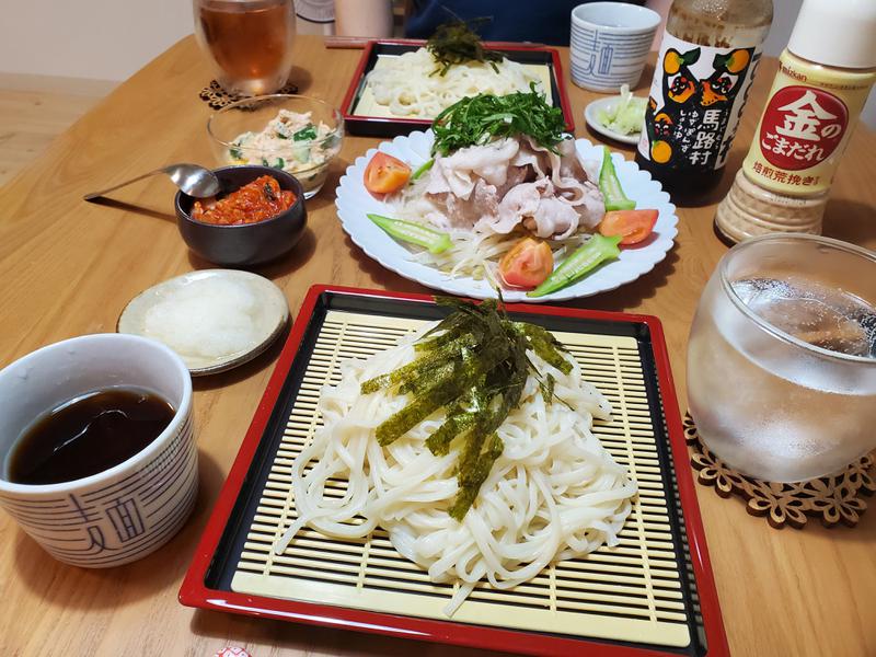 〆の夜ご飯は、ざるうどん&冷しゃぶ。夏っぽい食卓ですね😻。