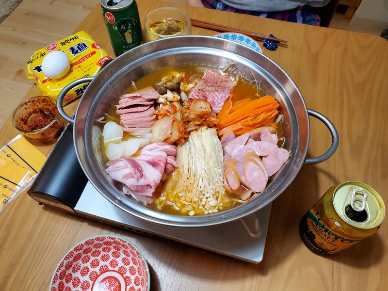 週末韓国料理😌今夜はプデチゲ。このためにスパムと豆もやし買ったよ~。もちろん美味しかった😌