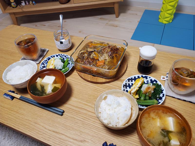 和食ご飯です。味噌汁久しぶりに作りました。暑くて作るきにならなかったもんね。